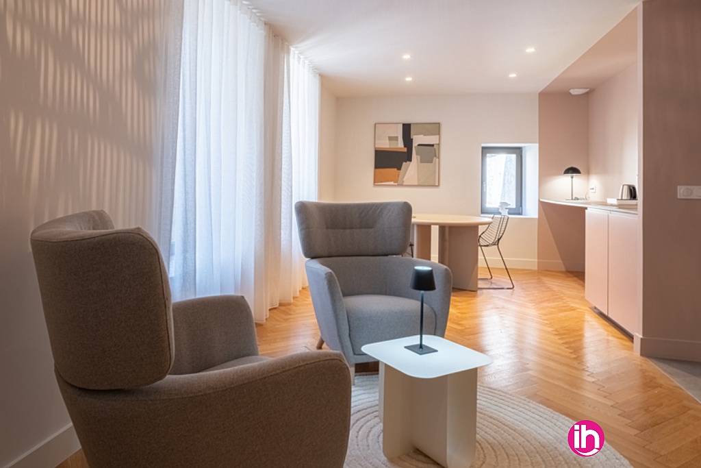 Appartement très calme, avec une pièce à vivre de 30 m², un coin nuit en alcôve de 9 m² ouvert sur la pièce à vivre qui peut se fermer avec un grand rideau occultant blanc.