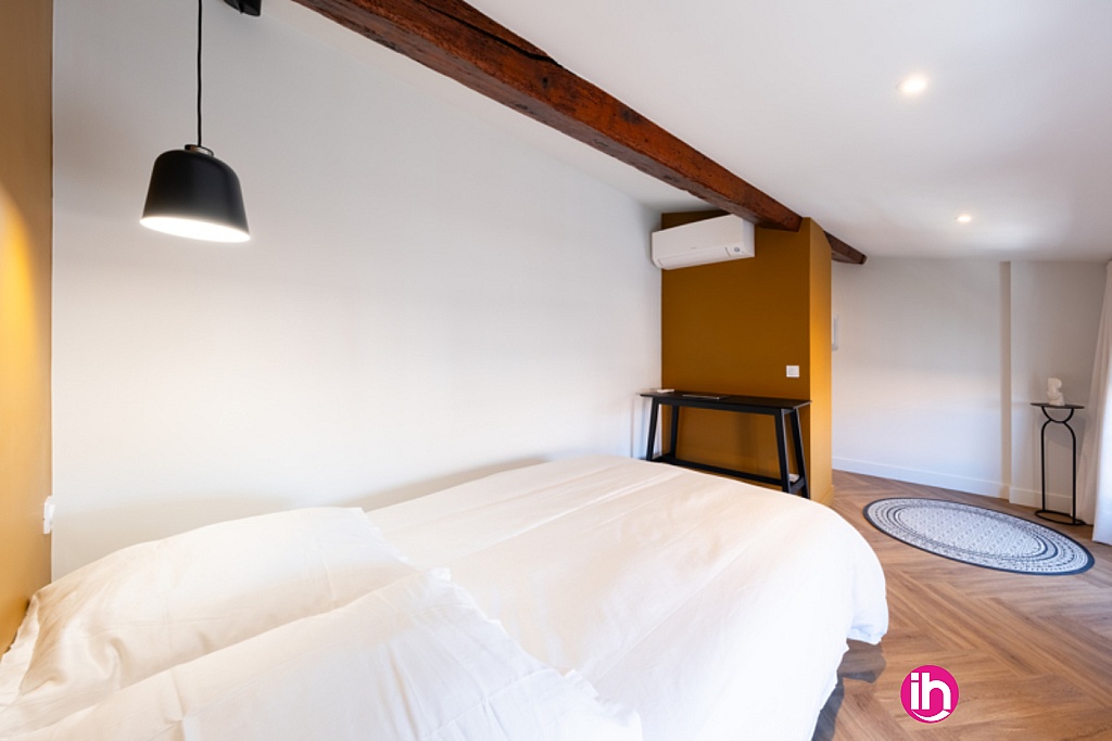 Cette location de maison à Pierrelatte, autrefois auberge, s’élève sur trois niveaux et s’organise en deux corps de bâtiment en U autour d’un jardin intérieur.