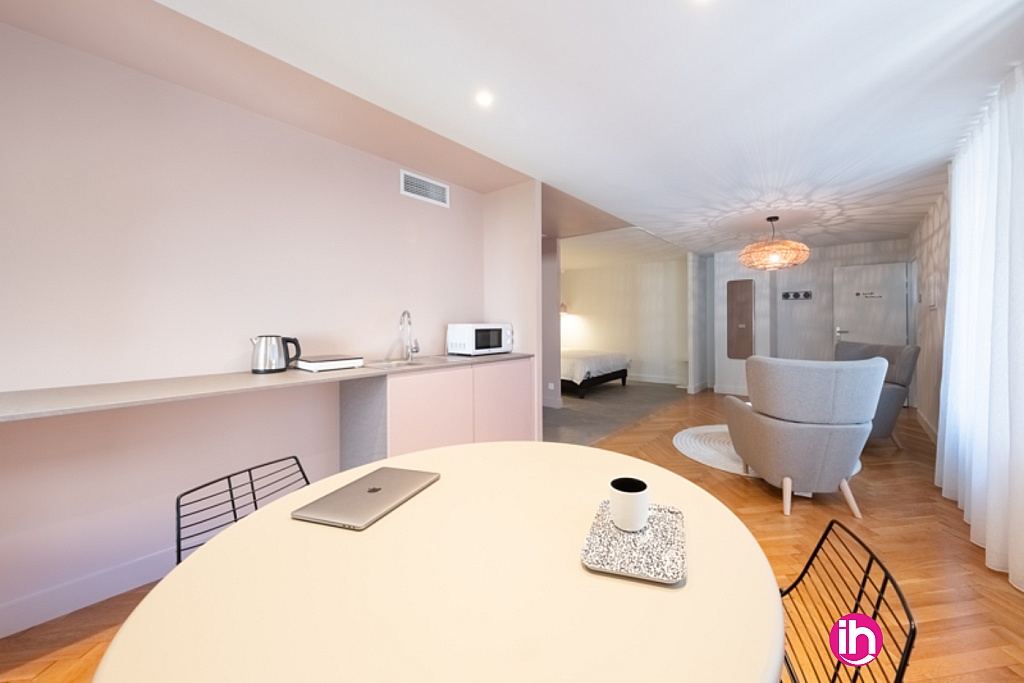 Appartement très calme, avec une pièce à vivre de 30 m², un coin nuit en alcôve de 9 m² ouvert sur la pièce à vivre qui peut se fermer avec un grand rideau occultant blanc.