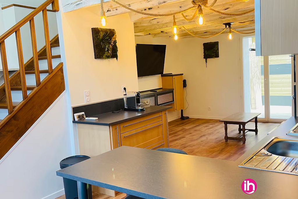 Vous trouverez une chambre lit double en entrant dans l’appartement à votre droite , un espace cuisine équipée avec un salon composé d’un canapé et téléviseur une autre chambre mezzanine lit double avec salle de bain