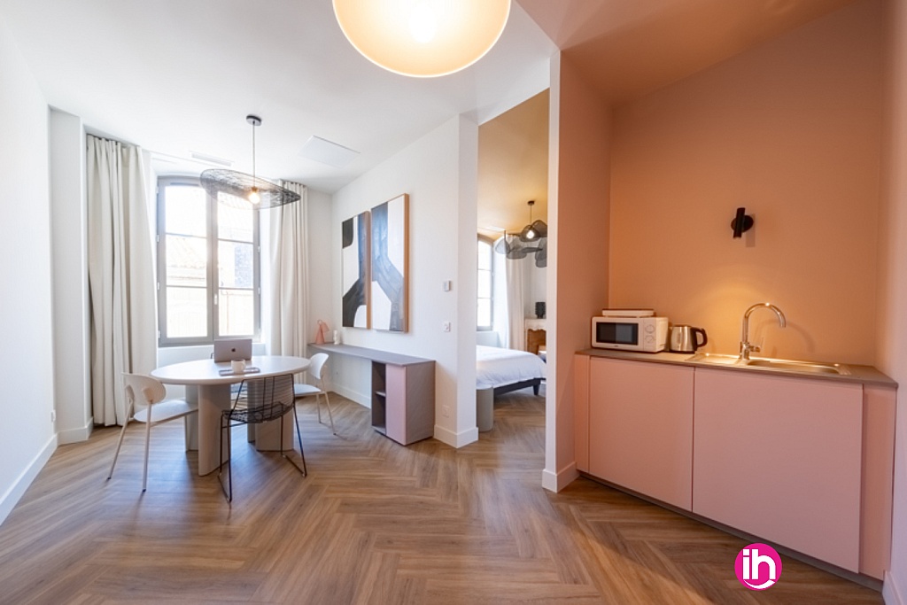 Espace de vie de 16,45 m² : petit salon, coin d’eau avec frigo, plan de travail bureau et table salle à manger.
