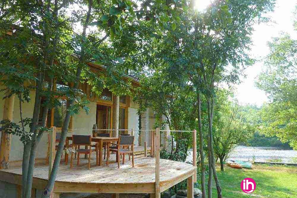 Une terrasse en bois ombragée donnant sur le jardin avec belle vue dégagée plein sud