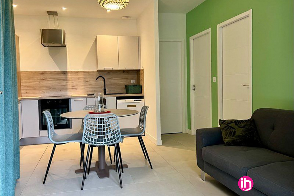 Une pièce à vivre aménagé d’une belle cuisine avec petit coin tv connectée, et d’une belle salle de bains.